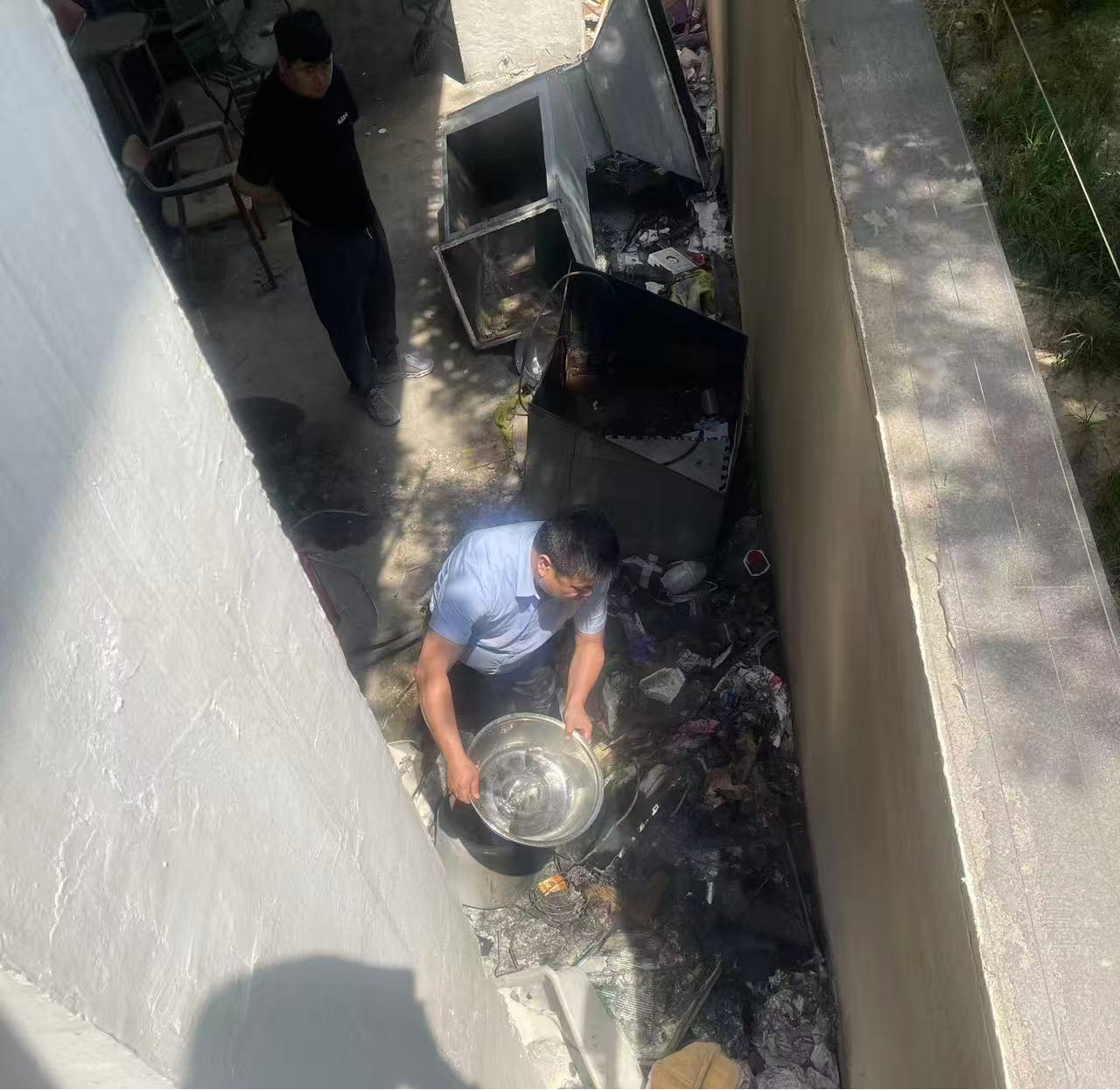 到达现场的救援人员迅速展开行动,然而,由于着火区域纸壳堆积量大,火势凶猛,使用灭火器扑救效果不佳。面对这一困境,嵇晓亮冷静分析,迅速做出决策,从临街商铺找来水盆,一盆接着一盆泼水压制火势。他不顾高温炙烤和浓烟呛鼻,与队员们争分夺秒地接力运水,在大家的共同努力下,火势逐渐得到控制。待明火完全熄灭后,嵇晓亮仍不放心,拿起铁锹仔细翻检燃烧过的区域,确保没有任何复燃的可能,才最终撤离现场。