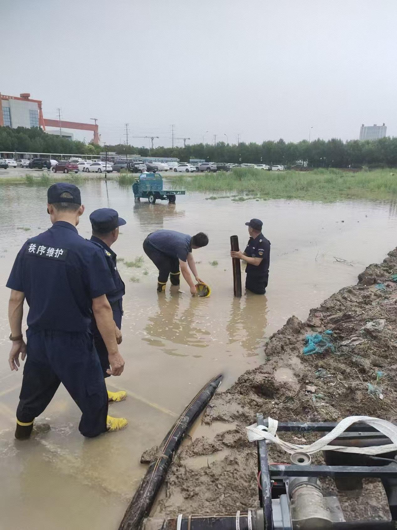 明湾公寓秩序部在接到停车场积水严重的报告后,迅速行动起来。他们没有丝毫犹豫,立刻集中全部力量,投入到紧张的排水工作中。