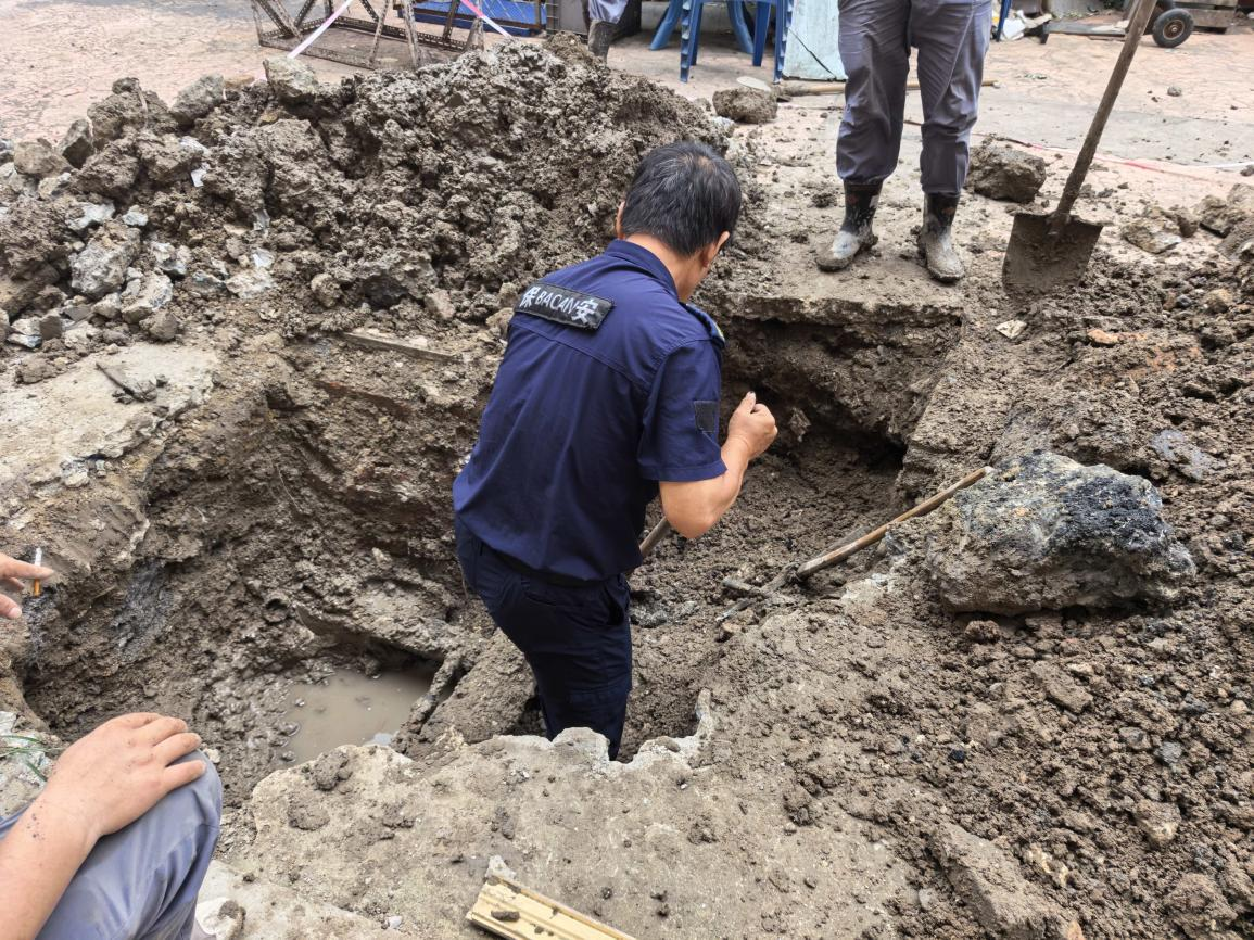 这份致谢,要从几天前说起。受连日降雨影响,众来鑫饭店工作人员清晨开门营业时,眼前的景象让他们瞬间慌了神。门前地面出现了一个约1.5平方米的塌陷坑,坑内水流正不断喷涌,埋在地下的自来水管因地面沉降被压爆了!浑浊的自来水顺着坑洞向外漫溢,很快淹没了门前的人行道,甚至倒灌进饭店一楼的操作间。不仅供水中断,连顾客进出的通道都被阻断,眼看营业时间越来越近,饭店经理万分着急,立刻拨通华盾保安驻建设公寓项目保安队的求助电话。