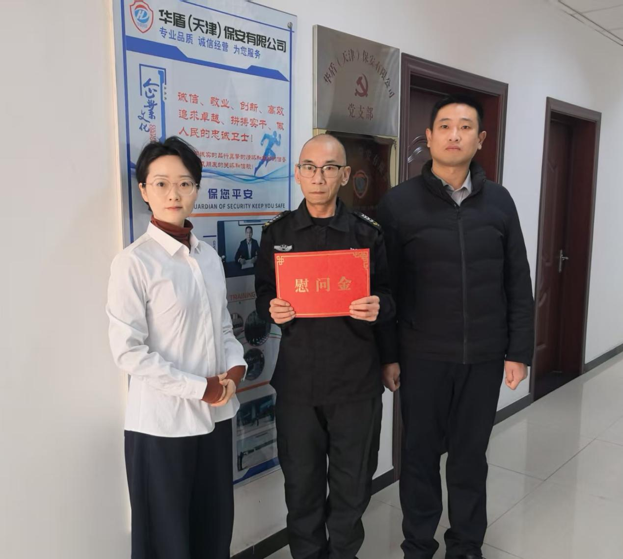 面对接踵而至的家庭变故和沉重的经济负担,张永平没有退缩,更没有将个人情绪带入工作。他将所有的辛酸与疲惫默默咽下,依然以饱满的热情投入到每一次执勤中,未因家庭困境影响过一天工作。华盾(天津)保安有限公司在获悉张永平同志的家庭困境后,第一时间伸出了援手。委托区域经理作为代表,慰问并送上了爱心捐款。这一举措不仅缓解了张永平的燃眉之急,更让他深切感受到了公司大家庭的温暖与关怀。